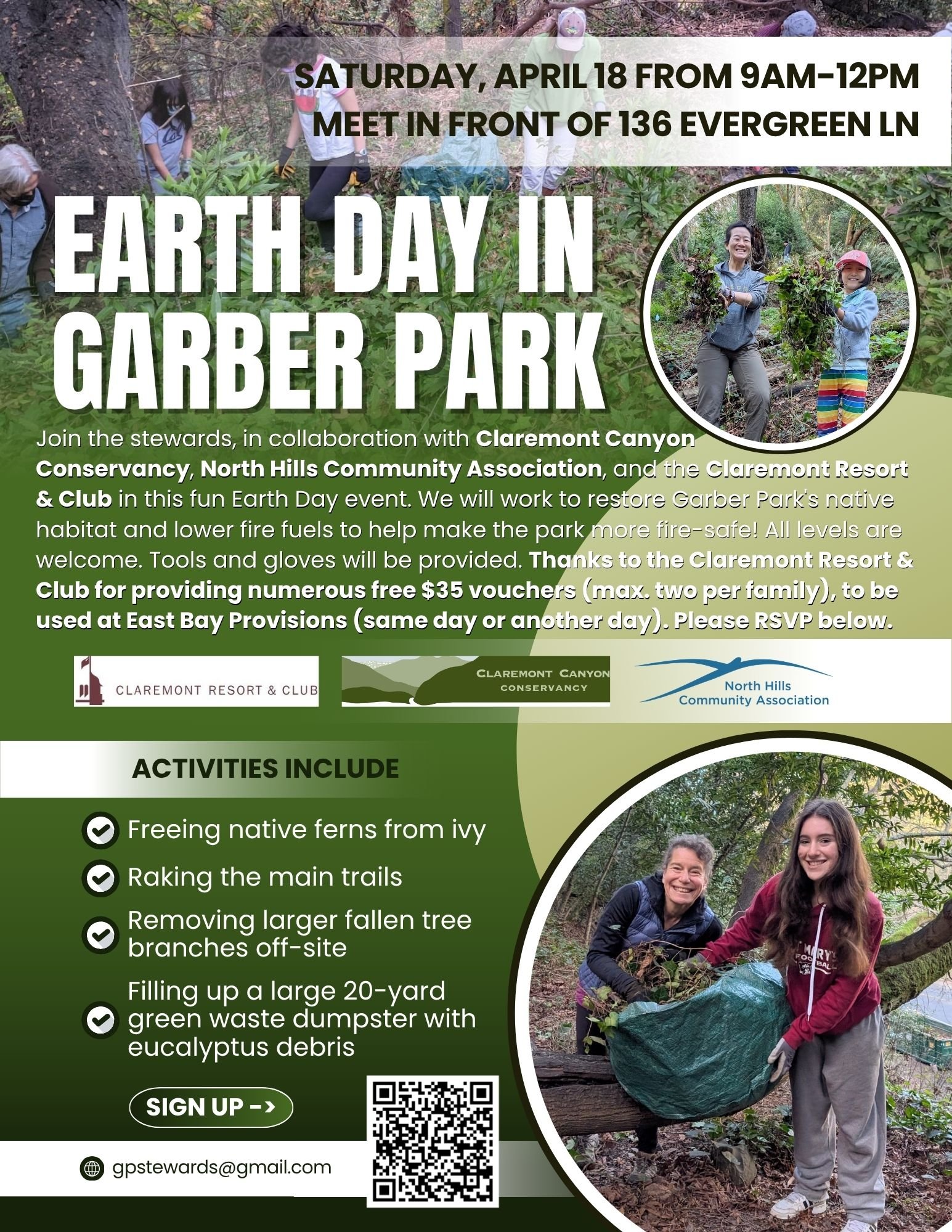 Visit this 13-acre park and help restore its native wild habitat (we meet year-round). This is an Earth Day volunteer event. Volunteers will remove many non-native and invasive plants and fill a large green waste dumpster provided by the City of Oakland. We will remove larger tree branches, eucalyptus debris, and ivy to lower fire fuels from Garber Park. Join the stewards, grab a rake and rake the main trails, grab a pair of loppers and help cut down fallen branches, and fill bags with eucalyptus debris to help make our park more fire safe!